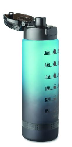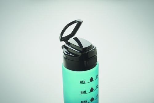 Sports water bottle in RPET, motivational time markings, one hand opening flip top lid, safety lock and carrying strap. Capacity: 1L.