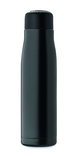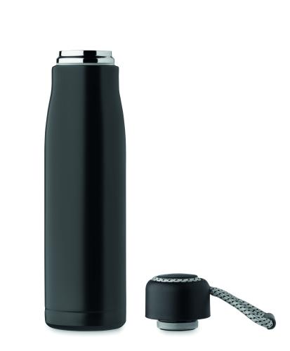 Double wall recycled stainless steel insulated vacuum bottle (90% recycled stainless steel and 10% stainless steel) with integrated cord grip on PP lid. Leak-free. Capacity: 500 ml.