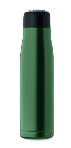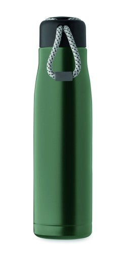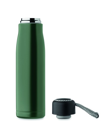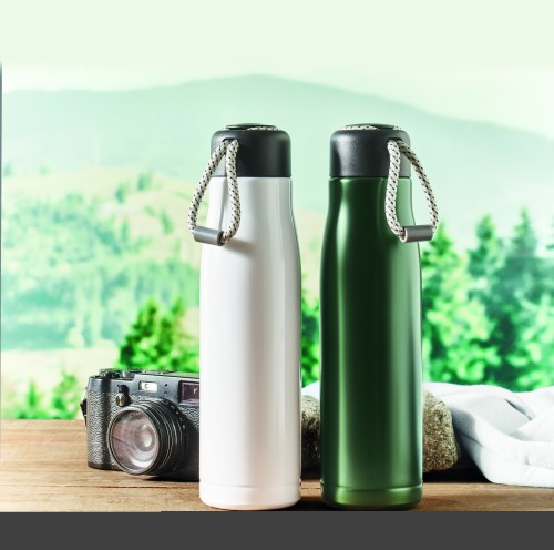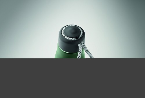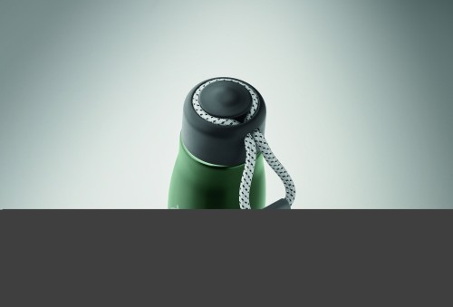 Double wall recycled stainless steel insulated vacuum bottle (90% recycled stainless steel and 10% stainless steel) with integrated cord grip on PP lid. Leak-free. Capacity: 500 ml.