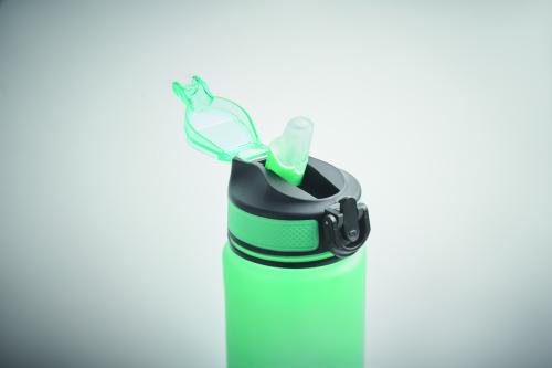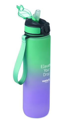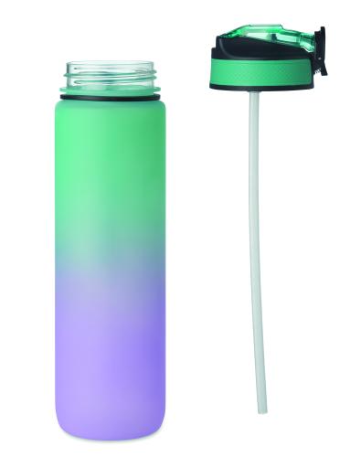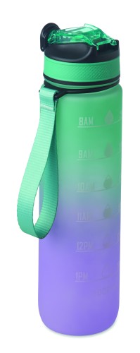 Sports water bottle in RPET with integrated straw, soft silicone mouth piece, motivational time markings, one hand opening flip top lid, safety lock and carrying strap. Capacity 1L.
