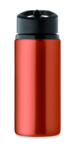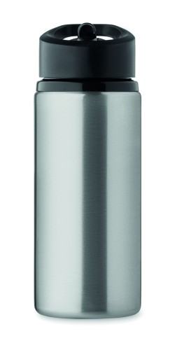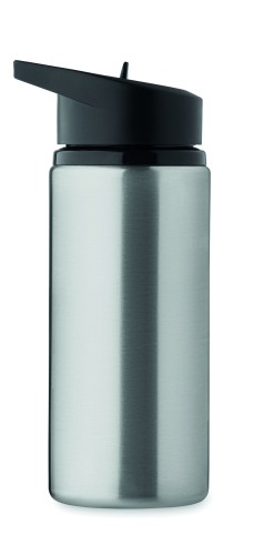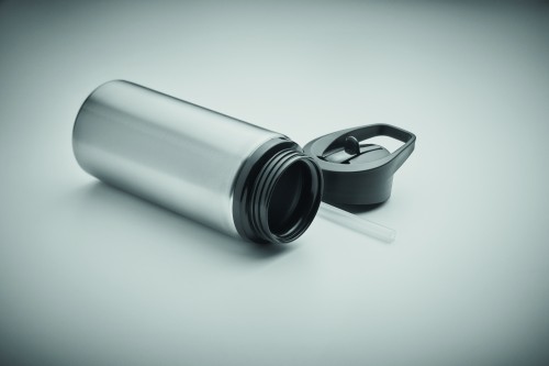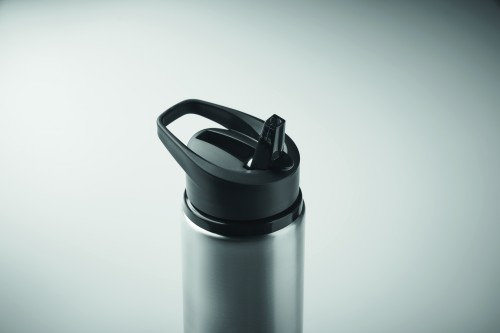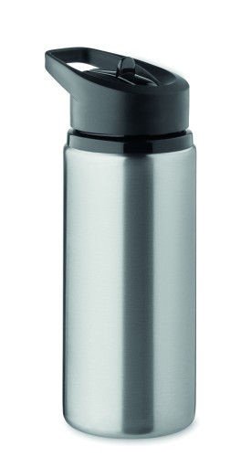 Recycled stainless steel (90% recycled stainless steel and 10% stainless steel) single wall bottle with foldable mouth piece, straw and lid with carrying handle. Capacity: 500 ml. As this is a single walled bottle, heat transfer can still occur.
