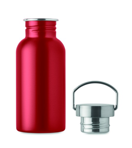 Single wall bottle in recycled stainless steel (90 % recycled stainless steel and 10% stainless steel) with lid and handle. Leak-free. Capacity: 500 ml. As this is a single walled bottle, heat transfer can still occur.
