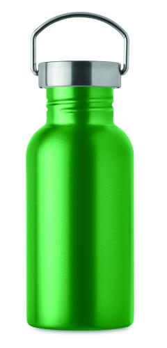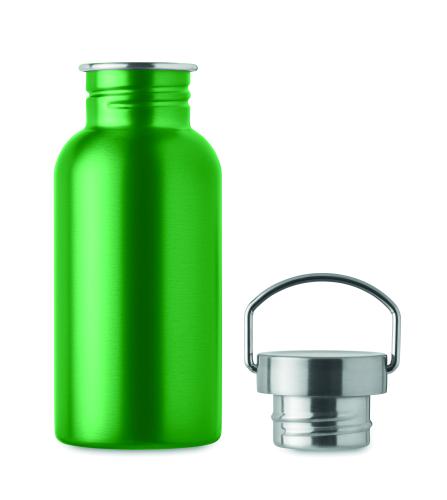 Single wall bottle in recycled stainless steel (90 % recycled stainless steel and 10% stainless steel) with lid and handle. Leak-free. Capacity: 500 ml. As this is a single walled bottle, heat transfer can still occur.