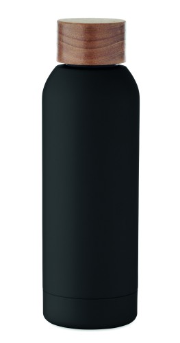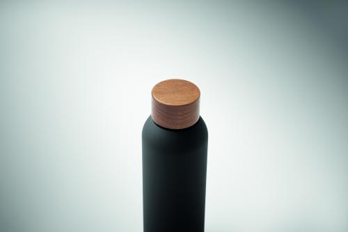 Single wall bottle recycled stainless steel (90% recycled stainless steel and 10% stainless steel) with rubber finish and acacia wooden lid finish. Leak-free. Capacity: 700 ml. As this is a single walled bottle heat transfer can still occur.