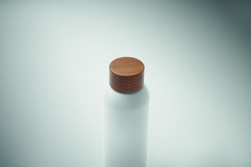 Single wall bottle recycled stainless steel (90% recycled stainless steel and 10% stainless steel) with rubber finish and acacia wooden lid finish. Leak-free. Capacity: 700 ml. As this is a single walled bottle heat transfer can still occur.
