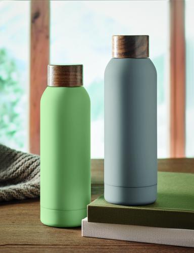 Single wall bottle recycled stainless steel (90% recycled stainless steel and 10% stainless steel) with rubber finish and acacia wooden lid finish. Leak-free. Capacity: 700 ml. As this is a single walled bottle heat transfer can still occur.