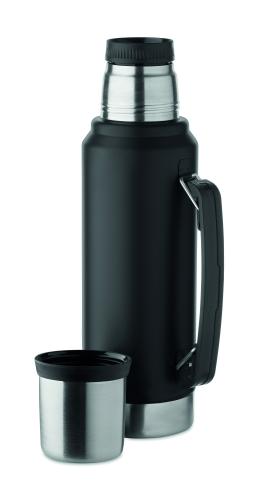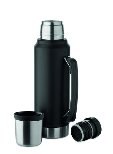 Double wall vacuum insulating bottle in recycled stainless steel (90% recycled stainless steel and 10% stainless steel) with handle on side. With PP lid and recycled stainless steel cup. Leak-free. Capacity: 1L.