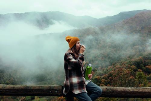 Double wall vacuum insulating bottle in recycled stainless steel (90% recycled stainless steel and 10% stainless steel) with handle on side. With PP lid and recycled stainless steel cup. Leak-free. Capacity: 1L.