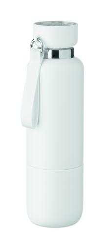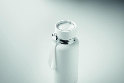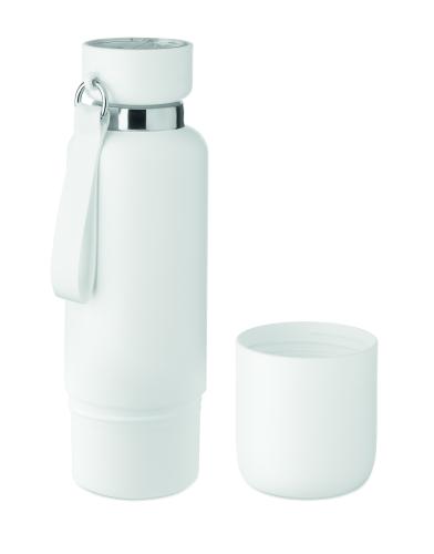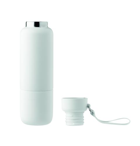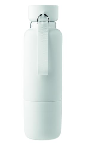Double wall insulated bottle in 90% recycled stainless steel and 10% stainless steel, with integrated strap handle and additional long strap (70cm) in PP lid. Leak-free. Bottom cup included. Capacity: 500 ml.