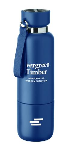Double wall insulated bottle in 90% recycled stainless steel and 10% stainless steel, with integrated strap handle and additional long strap (70cm) in PP lid. Leak-free. Bottom cup included. Capacity: 500 ml.