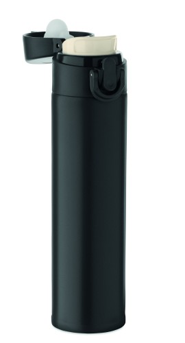 Double wall drinking bottle in recycled stainless steel (90% recycled stainless steel and 10% stainless steel) with security lock on the lid and press-to-open option. Leak free. Capacity: 300ml.
