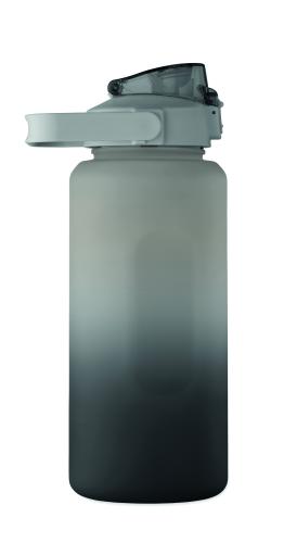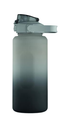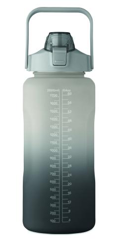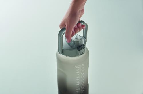 Motivational water bottle in RPET. Features a one-hand open flip-top lid with straw, safety lock, and handle. Leak-free. Capacity : 2000 ml