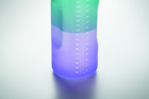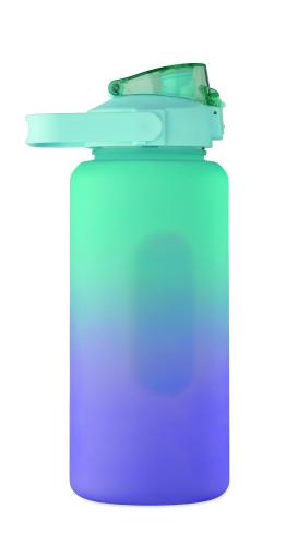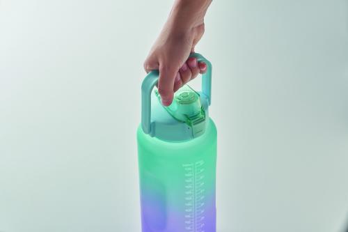 Motivational water bottle in RPET. Features a one-hand open flip-top lid with straw, safety lock, and handle. Leak-free. Capacity : 2000 ml