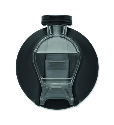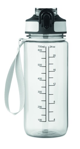 Motivational sports water bottle in RPET with integrated straw, soft silicone mouth piece, one hand opening flip top lid, safety lock. With carrying strap in RPET satin. Capacity 700 ml. Leak free.
