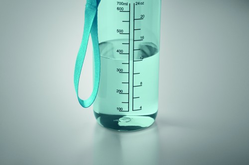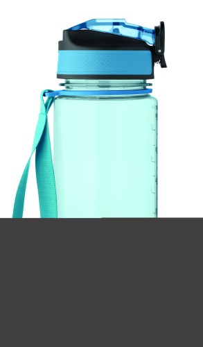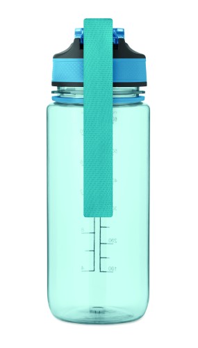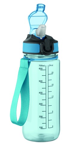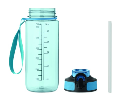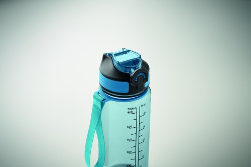 Motivational sports water bottle in RPET with integrated straw, soft silicone mouth piece, one hand opening flip top lid, safety lock. With carrying strap in RPET satin. Capacity 700 ml. Leak free.