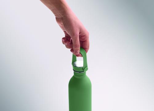 Single wall bottle made of 90 % recycled stainless steel and 10% stainless steel with rubber finish. Includes PP and SS lid with silicone handle. Capacity: 500 ml.
