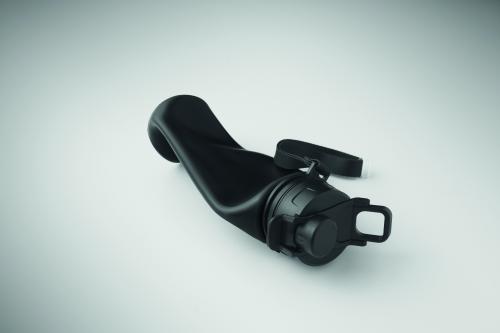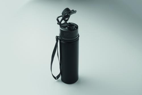 Foldable silicone sports bottle with PP lid, handle, polyester strap, and transparent buckle to secure when folded. Leak-free. Capacity: 500 ml.