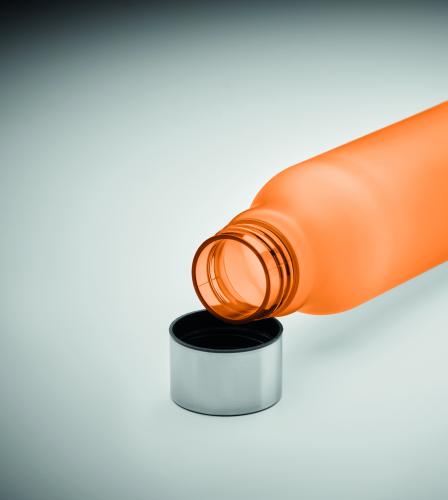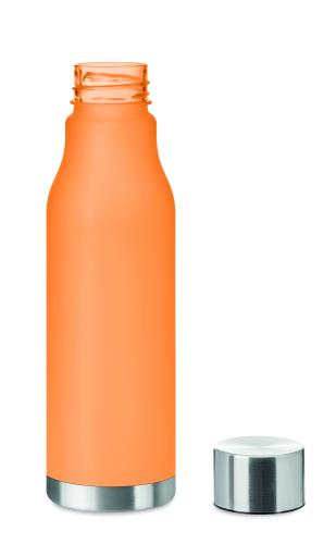 Drinking bottle in RPET with rubberised finish (frosted transparent) and stainless steel cap with inner RPET lid and silicone ring. BPA free. Leak-free. Capacity: 600 ml. Not suitable for carbonated drinks.