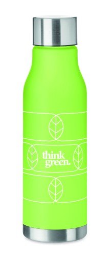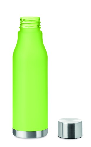 Drinking bottle in RPET with rubberised finish (frosted transparent) and stainless steel cap with inner RPET lid and silicone ring. BPA free. Leak-free. Capacity: 600 ml. Not suitable for carbonated drinks.
