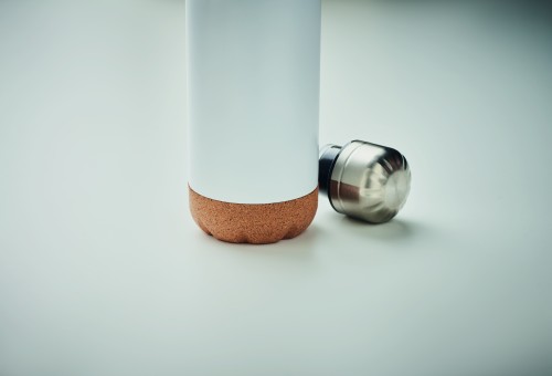 Double wall stainless steel vacuum bottle with cork base detail. Capacity: 500 ml. Leak free. Cork is 100% natural material. Due to its structural nature and surface porosity the final print result per item may have deviations.