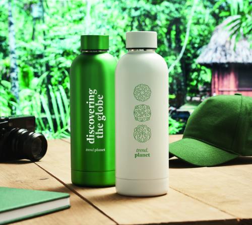 Double wall insulating vacuum bottle in recycled stainless steel (90% recycled stainless steel and 10% stainless steel). Capacity 500 ml. Leak free.