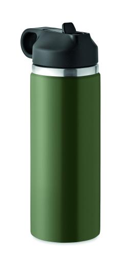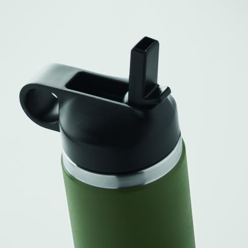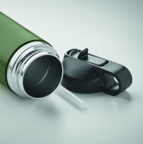 Double wall recycled stainless steel (90% recycled stainless and 10% stainless steel) insulated vacuum bottle with grip handle lid in PP and integrated straw built-in straw cap. Leak-free. Capacity: 500 ml.