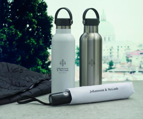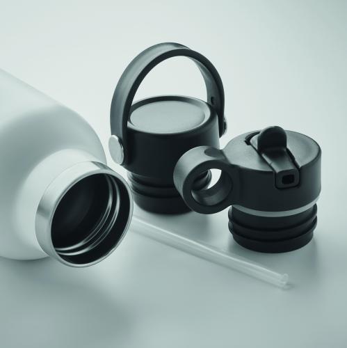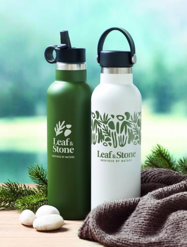 Double wall recycled stainless steel (90% recycled stainless and 10% stainless steel) insulated vacuum bottle with non-leak screw cap and additional interchangeable built-in straw cap. Capacity: 700 ml.