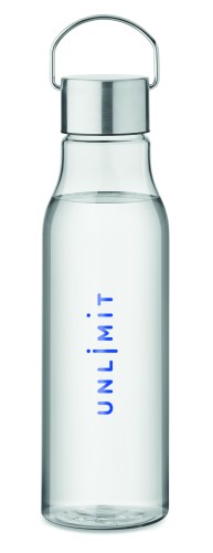 Drinking bottle in RPET which is BPA free and stainless steel cap with lid handle. Leak free. Capacity: 600 ml.