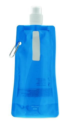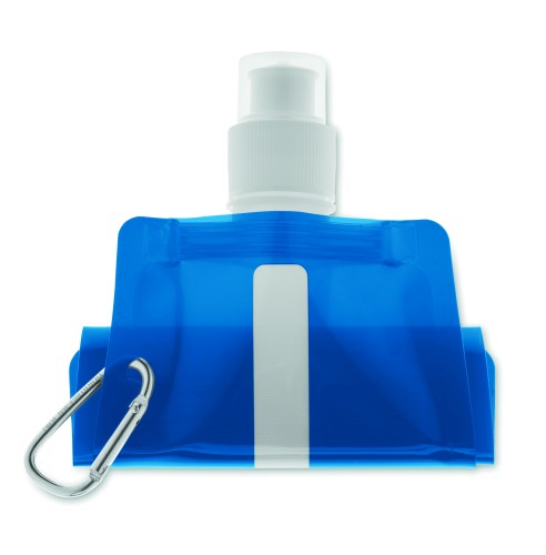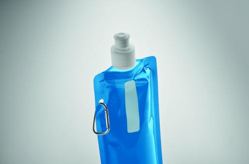 Foldable water bottle in PET which is BPA free with aluminium carabiner. Capacity 480 ml. Leak free.