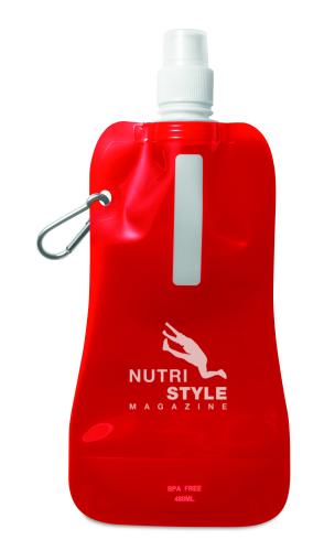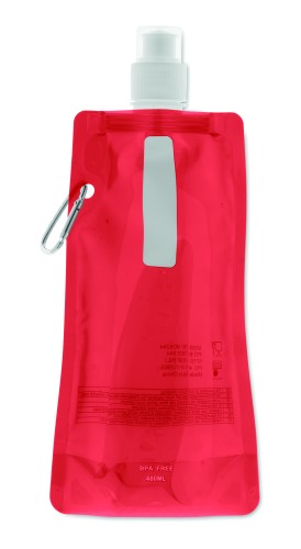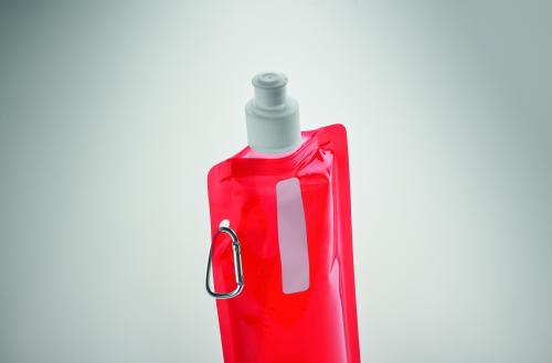 Foldable water bottle in PET which is BPA free with aluminium carabiner. Capacity 480 ml. Leak free.