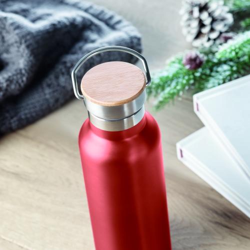 Double wall stainless steel insulating vacuum flask with lid in bamboo and carry handle. Capacity: 500 ml. Sublimation print available on white item only. Leak free. Bamboo is a natural product, there may be slight variations in colour and size per item, which can affect the final decoration outcome.