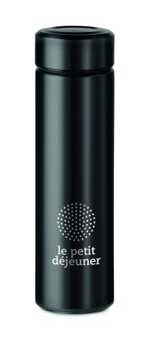 Double wall stainless steel insulating vacuum flask with additional tea infuser. Capacity 425 ml. Leak free.
