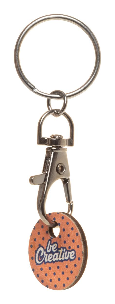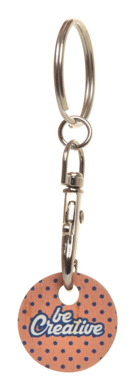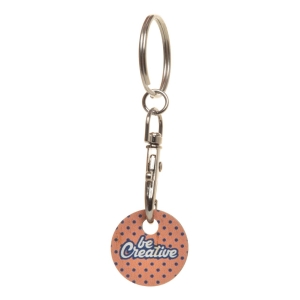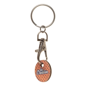 Fém karabineres kulcstartó full colour nyomtatott, rétegelt fa lemezből készült bevásárlókocsi érmével. Az ár tartalmazza az UV LED nyomtatást az egyik oldalon. Érme mérete: ø23×2 mm. Minimális rendelési mennyiség: 200 db.