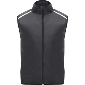 Szélálló és légáteresztő. Elülső cipzár azonos színű állvédővel. Rugalmas szegély a karkivágásnál és az alján. A hát alsó része mikroperforált anyagból készült. Fényvisszaverő csíkok a vállán. Zseb rugalmas pánttal, amelybe a mellényt el lehet csomagolni. Eltávolítható címke.