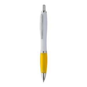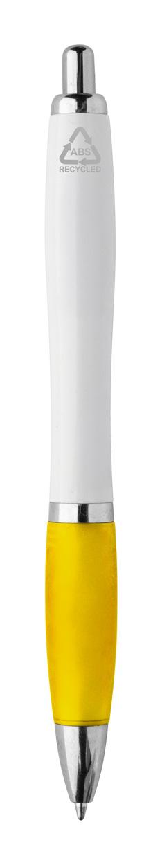 Újrahasznosított ABS műanyag golyóstoll fehér testtel, színes markolattal és króm részekkel. Kék tollbetéttel.