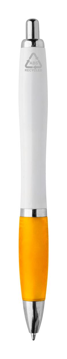 Újrahasznosított ABS műanyag golyóstoll fehér testtel, színes markolattal és króm részekkel. Kék tollbetéttel.