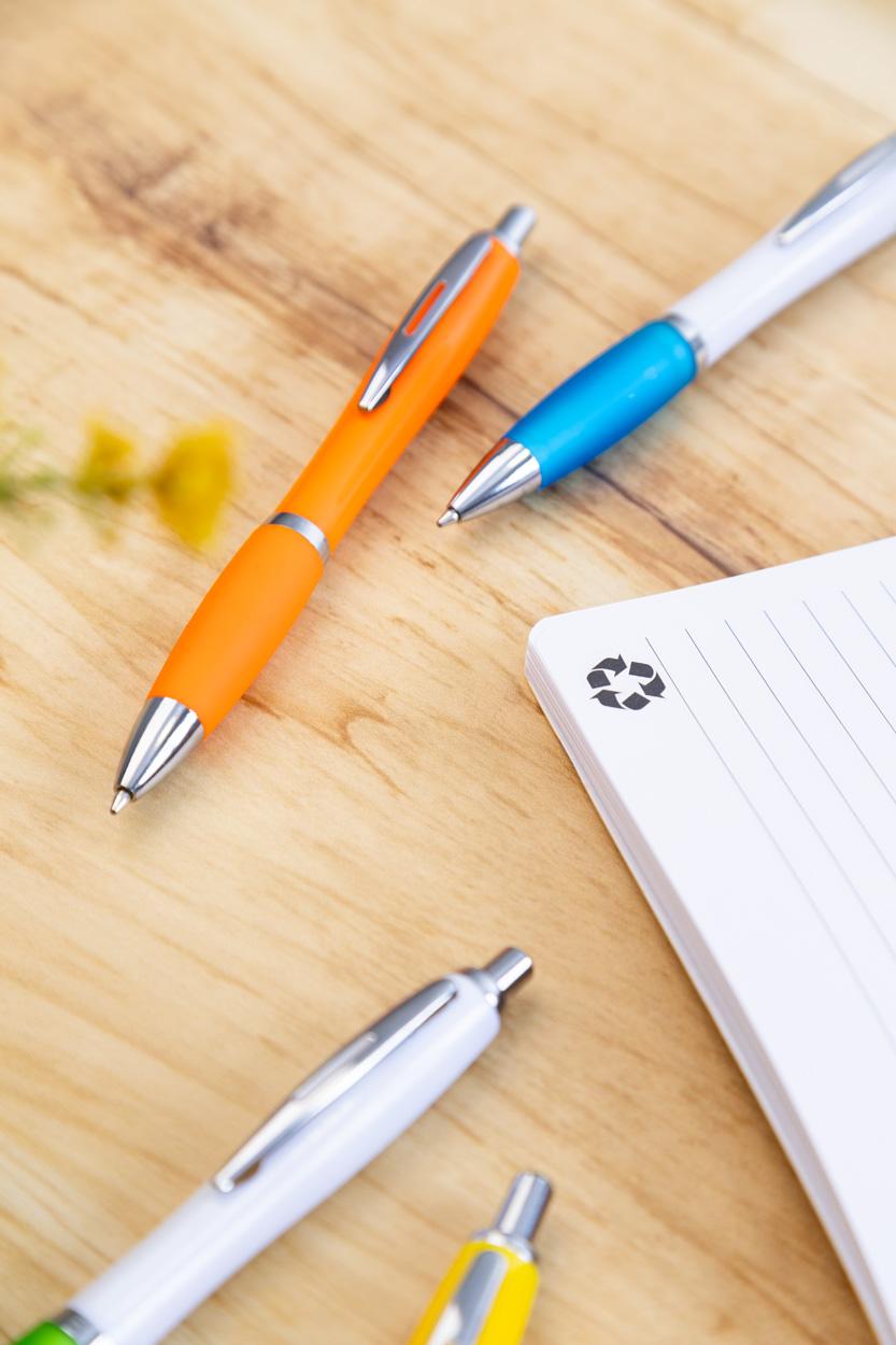 | Termék leírás | Újrahasznosított ABS műanyag golyóstoll fehér testtel, színes markolattal és króm részekkel. Kék tollbetéttel. |