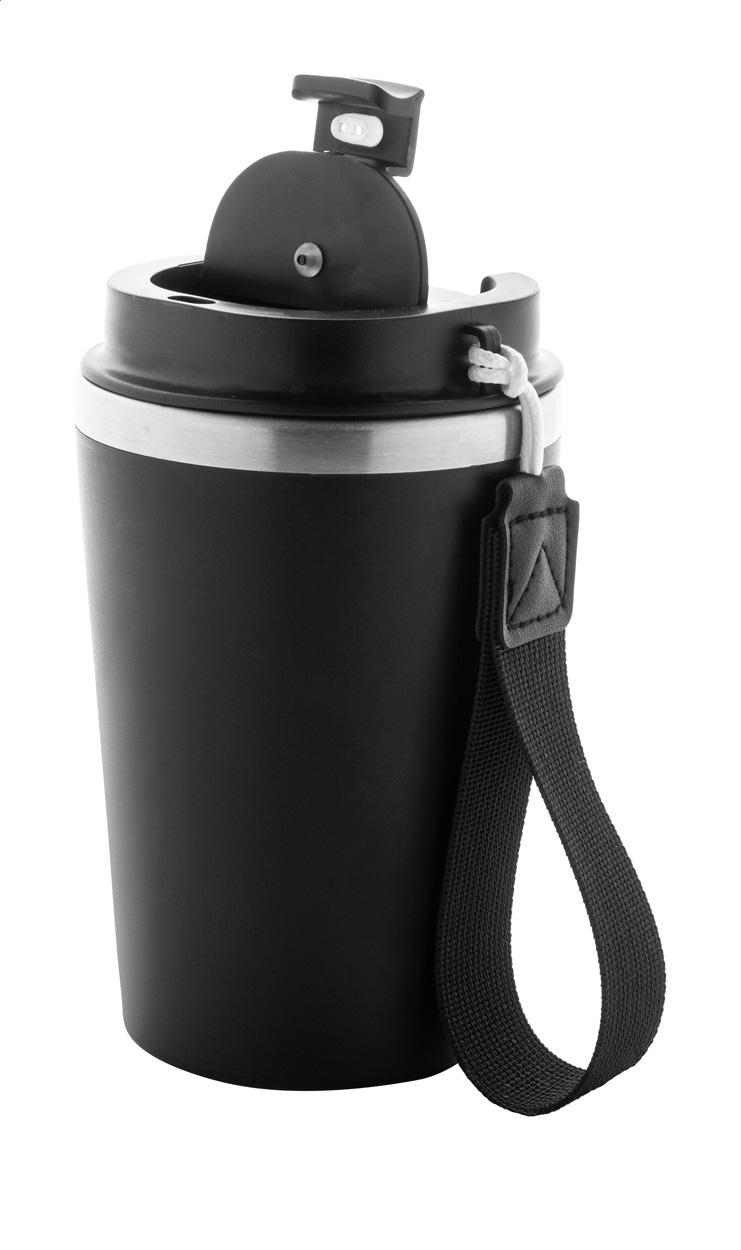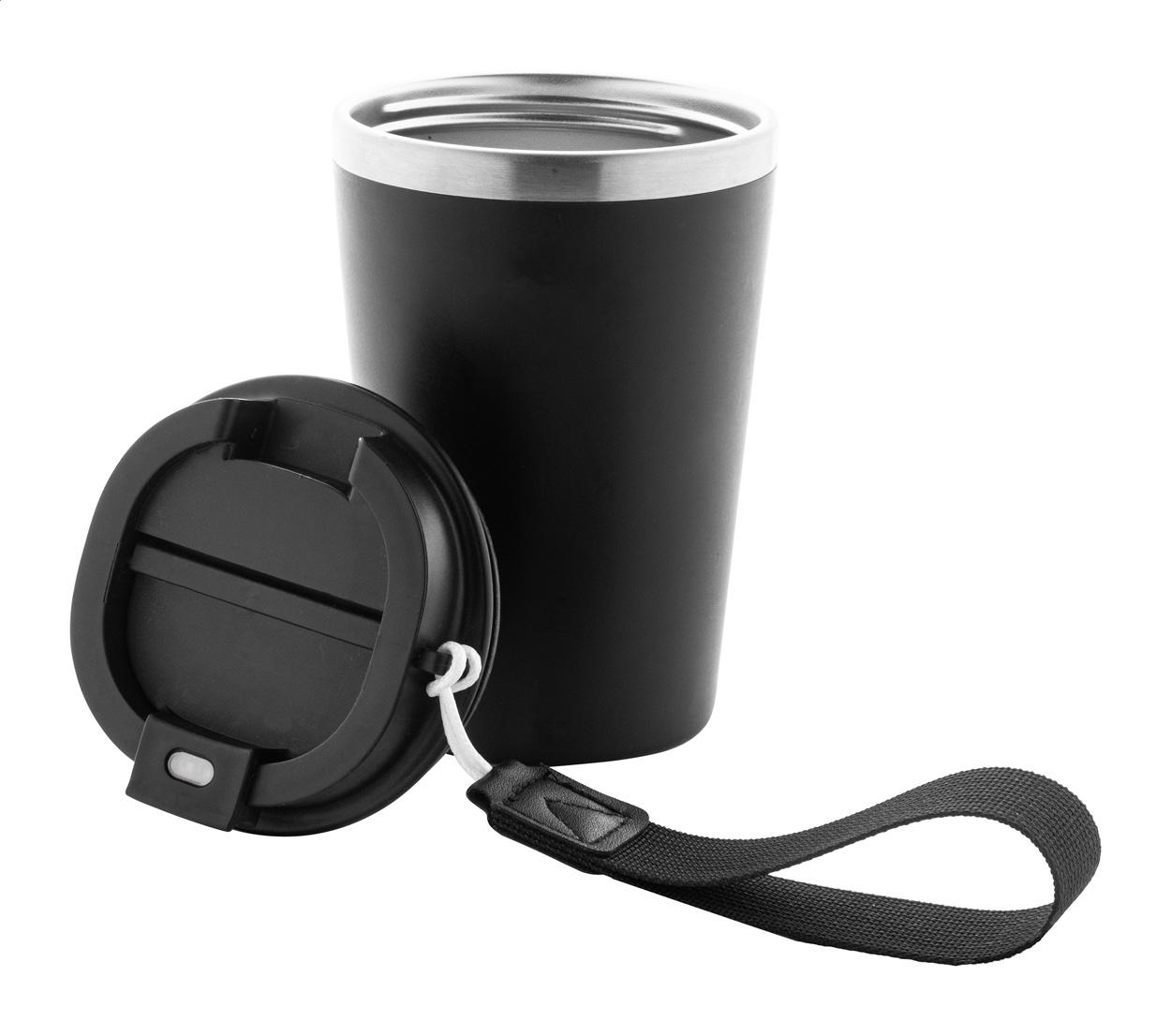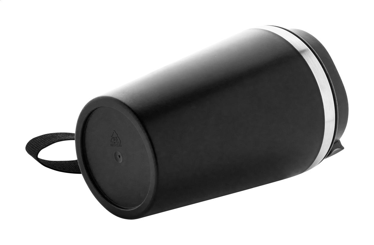 Duplafalú, újrahasznosított rozsdamentes acélból készült hőszigetelt thermo pohár, PP műanyag külsővel és ivófedéllel. RPET hordpánttal. 350 ml.