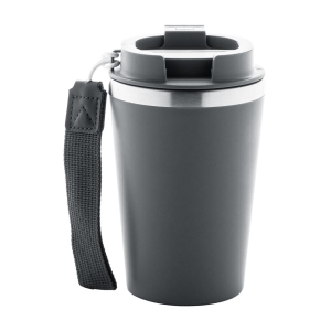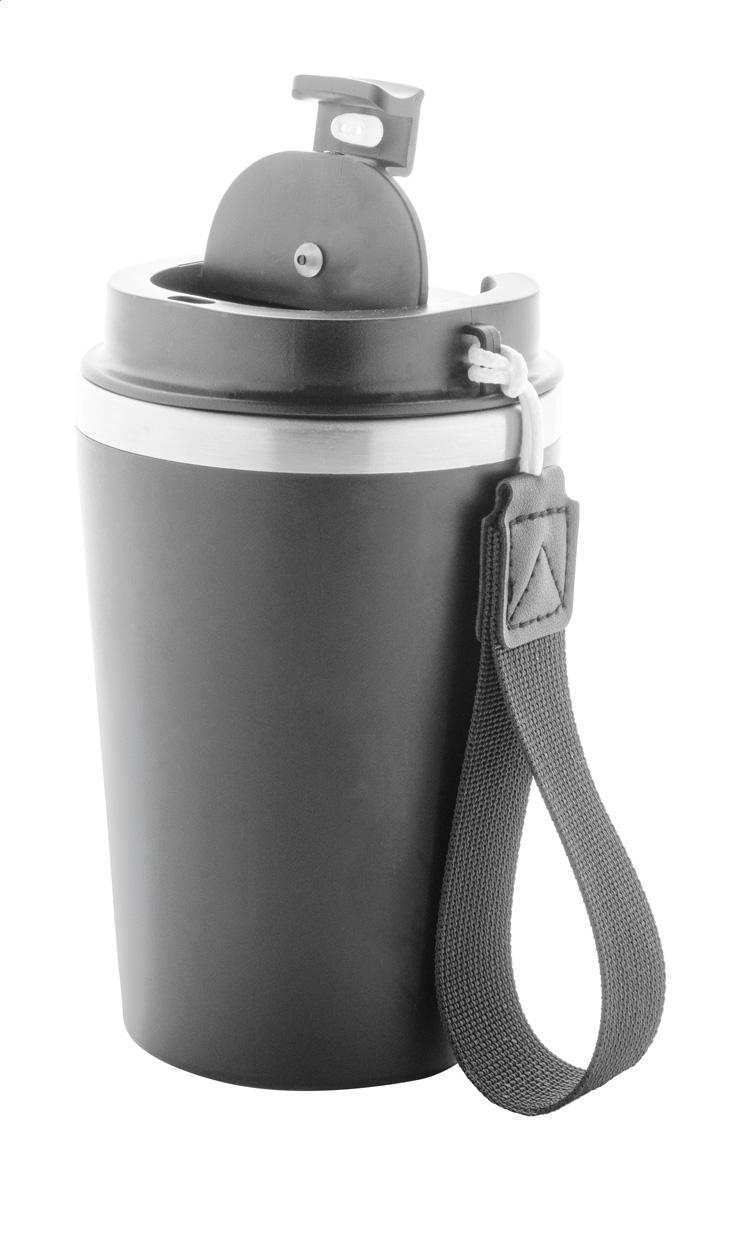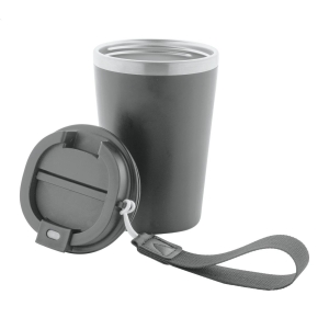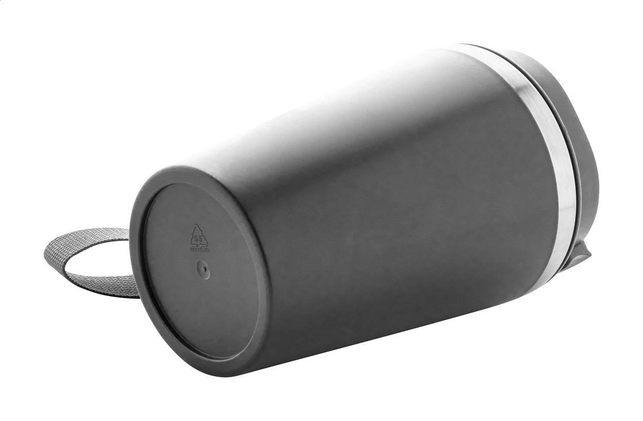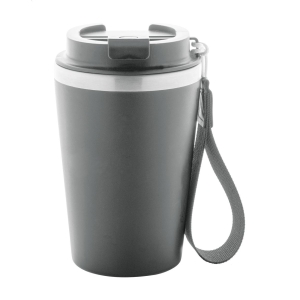 Duplafalú, újrahasznosított rozsdamentes acélból készült hőszigetelt thermo pohár, PP műanyag külsővel és ivófedéllel. RPET hordpánttal. 350 ml.