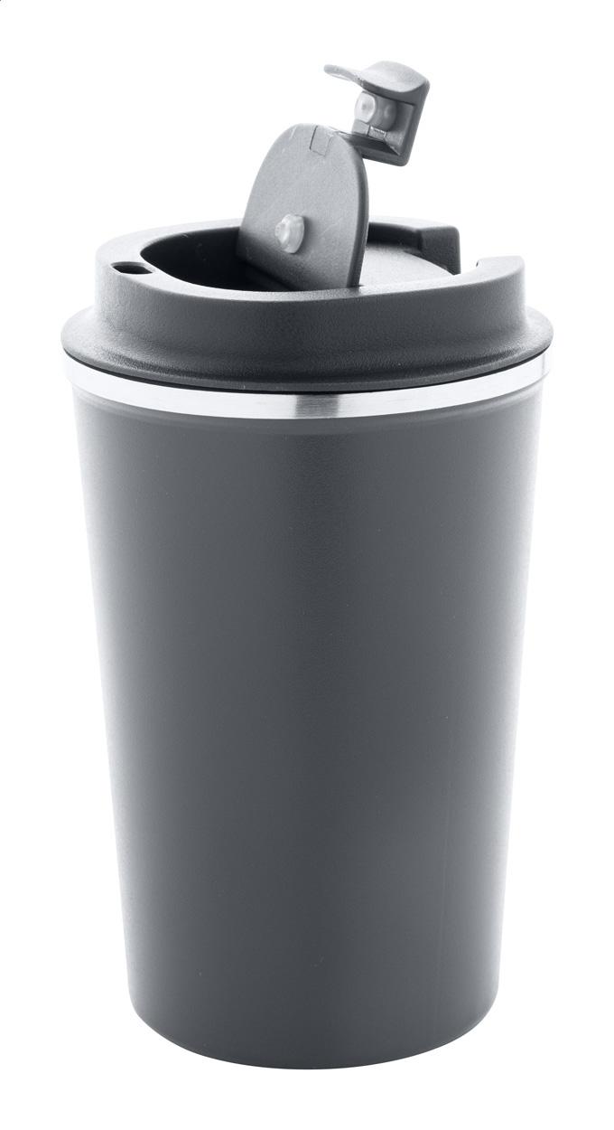 Duplafalú, újrahasznosított rozsdamentes acélból készült hőszigetelt thermo pohár, PP ivófedéllel. 350 ml.